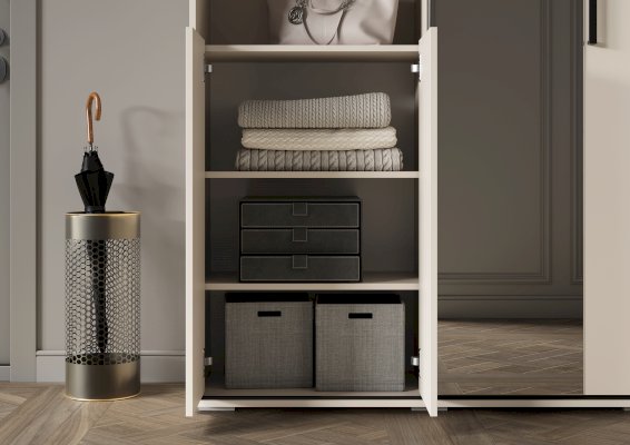 Разделение на секции: Одна часть прихожей включает две одинаковые секции с полками, закрытые створками. В каждой секции предусмотрено по две съёмные полки, что позволяет настраивать пространство под ваши нужды. Открывание створок осуществляется за выступ, что делает использование шкафа более удобным.