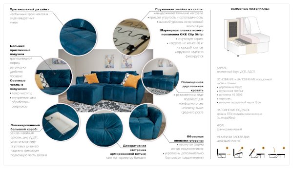 Мягкий диван повышенной комфортности, на котором приятно проводить время. Классический дизайн, округлые мягкие формы, утопающая посадка - все это делает его незаменимым для отдыха. Украшением дивана является декоративная прострочка и стяжки на спинке, подлокотниках и посадочном месте, которая благодаря своим свойствам повышает прочность и износоустойчивость обивки. Две большие подушки регулируют удобство посадки, после сидения моментально восстанавливают первоначальную форму. Механизм трансформации тик-так и мягкие элементы превращают диван в полноценную кровать. Большой бельевой короб для хранения вещей – приятное дополнение к дивану. Универсальный угол - переставляется на левую или правую сторону основной секции, удобно при частых перестановках.